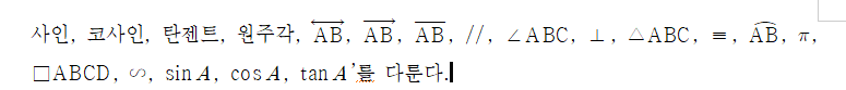๐ข ‘๋ํ๊ณผ ์ธก์ ’ ์์ญ์์๋ ์ฉ์ด์ ๊ธฐํธ๋ก ‘๊ต์ , ๊ต์ , ๋ ์ ์ฌ์ด์ ๊ฑฐ๋ฆฌ, ์ค์ , ์์ง์ด๋ฑ๋ถ์ , ๊ผฌ์ธ ์์น, ๊ต๊ฐ, ๋ง๊ผญ์ง๊ฐ, ์๊ฐ, ๋์๊ฐ, ํ๊ฐ, ์ง๊ต, ์์ ์ ๋ฐ, ์๋, ๋๋ณ, ๋๊ฐ, ์ผ๊ฐํ์ ํฉ๋ ์กฐ๊ฑด, ๋ด๊ฐ, ์ธ๊ฐ, ๋ถ์ฑ๊ผด, ์ค์ฌ๊ฐ, ํธ, ํ, ํ๊ผด, ํ ์ , ๋ค๋ฉด์ฒด, ๊ฐ๋ฟ๋, ์ ๋ค๋ฉด์ฒด, ํ์ ์ฒด, ํ์ ์ถ, ์๋ฟ๋, ์ฆ๋ช , ์ ์ , ์ ์ , ์ ํ๋ค, ์ธ์ฌ, ์ธ์ , ์ธ์ ์, ๋ด์ฌ, ๋ด์ , ๋ด์ ์, ์ค์ , ๋ฌด๊ฒ์ค์ฌ, ๋ฎ์, ๋ฎ์๋น, ์ผ๊ฐํ์ ๋ฎ์ ์กฐ๊ฑด, ํผํ๊ณ ๋ผ์ค ์ ๋ฆฌ, ์ผ๊ฐ๋น,