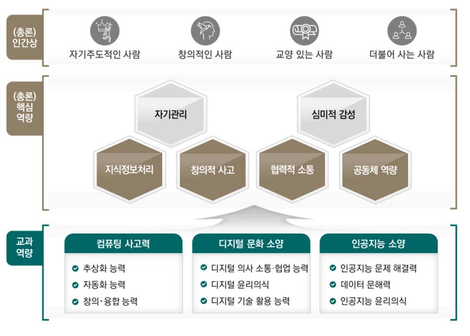 μ¦, ‘λμ§νΈ μΈμμ λ°μ΄ν°μ μ 보λ₯Ό λ€λ£¨λ μ»΄ν¨ν μμ€ν μ λν μ΄ν΄λ₯Ό κΈ°λ°μΌλ‘ λ°μ΄ν°λ₯Ό μ²λ¦¬νλ λ₯λ ₯μ κΈ°λ₯΄λ κ²’, ‘μ»΄ν¨ν μ νμ©ν λ¬Έμ  ν΄κ²°μ μν΄ λ¬Έμ λ₯Ό λ°κ²¬, μ΄ν΄νμ¬ λ€μν ν΄λ²μ μ€κ³νκ³ νλ‘κ·Έλ¨μ ν΅ν΄ ꡬνν΄ κ°λ μλνμ μ€μμ±μ μ΄ν΄νκ³ μ€μ²νλ νλλ₯Ό κΈ°λ₯΄λ κ²’, κ·Έλ¦¬κ³ ‘λμ§νΈ μΈμμ μ΄μκ°κΈ° μν μ€λ¦¬λ₯Ό μ€μ²νλ©°, μΈκ³΅μ§λ₯μΌλ‘ μΈν μΈμμ λ³νλ₯Ό μ΄ν΄νκ³ μΈκ³΅μ§λ₯μ ν΅ν΄ ν΄κ²° κ°λ₯ν λ¬Έμ λ₯Ό νμνκ³ ν΄κ²°νκΈ° μν λ₯λ ₯κ³Ό νλλ₯Ό κ°μΆλ κ²’μ λͺ©νλ₯Ό ν΅ν΄ κ΅κ³Όμ μλμ΄ λ°νλ μ μλλ‘ κ΅¬μ± μ²΄κ³λ₯Ό μ μνμλ€.
